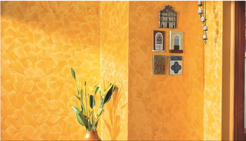 - स्प्लैश इफ़ेक्ट : इस टेक्सचर से सजी दीवारें गहरे पीले , ऑरेंज आदि रंगों से चमकती पॉप आर्ट की कलात्मकता को दर्शाती नज़र आती हैं।